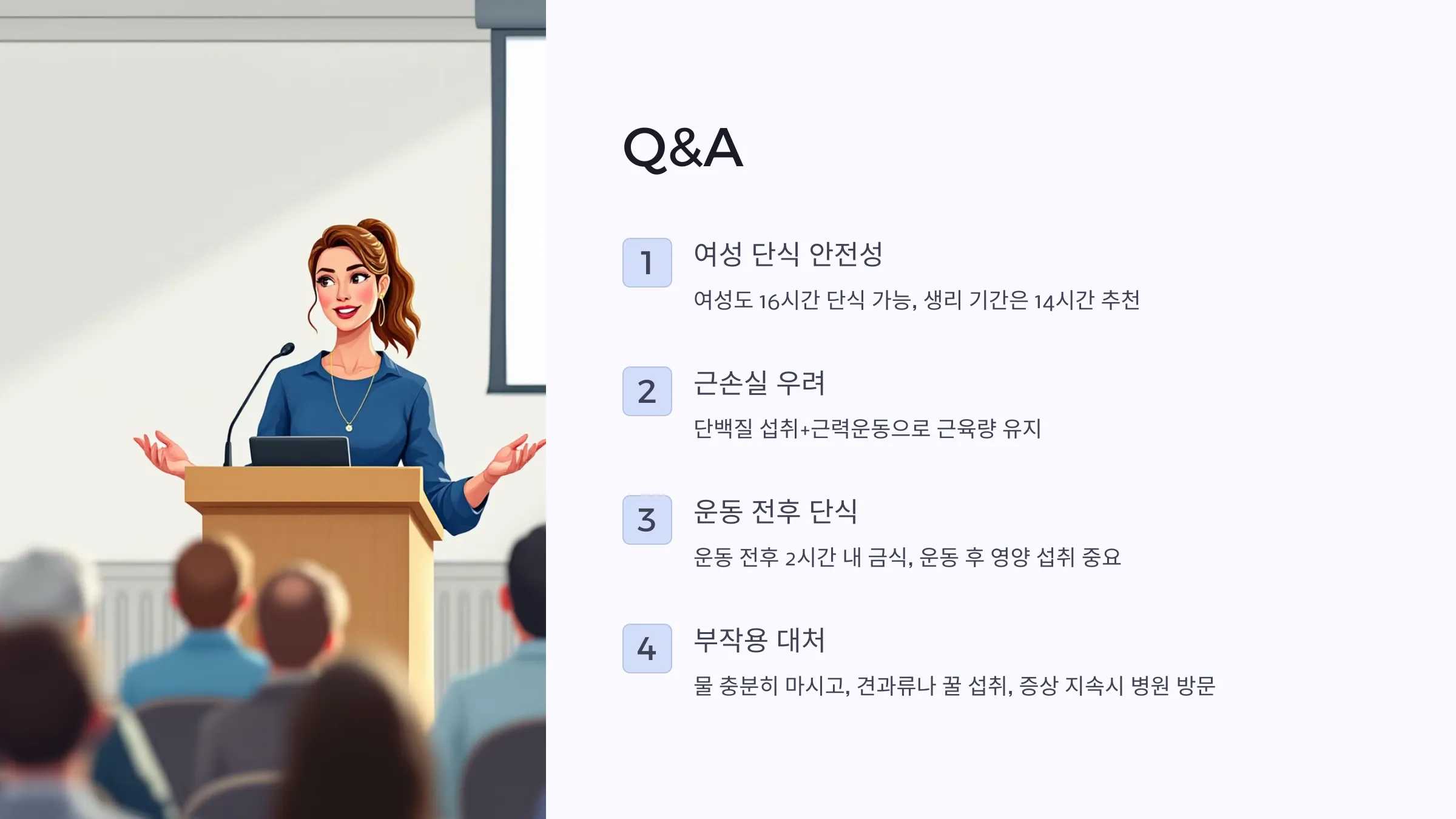 A: 네, 오히려 여성 호르몬 균형에 도움이 됩니다. 다만 생리 기간에는 14시간으로 단축하는 것을 권장합니다. 호주 시드니 대학교의 연구에 따르면, 여성의 경우 단식으로 인한 에스트로겐 분비 조절이 체지방 감소에 더욱 효과적입니다.