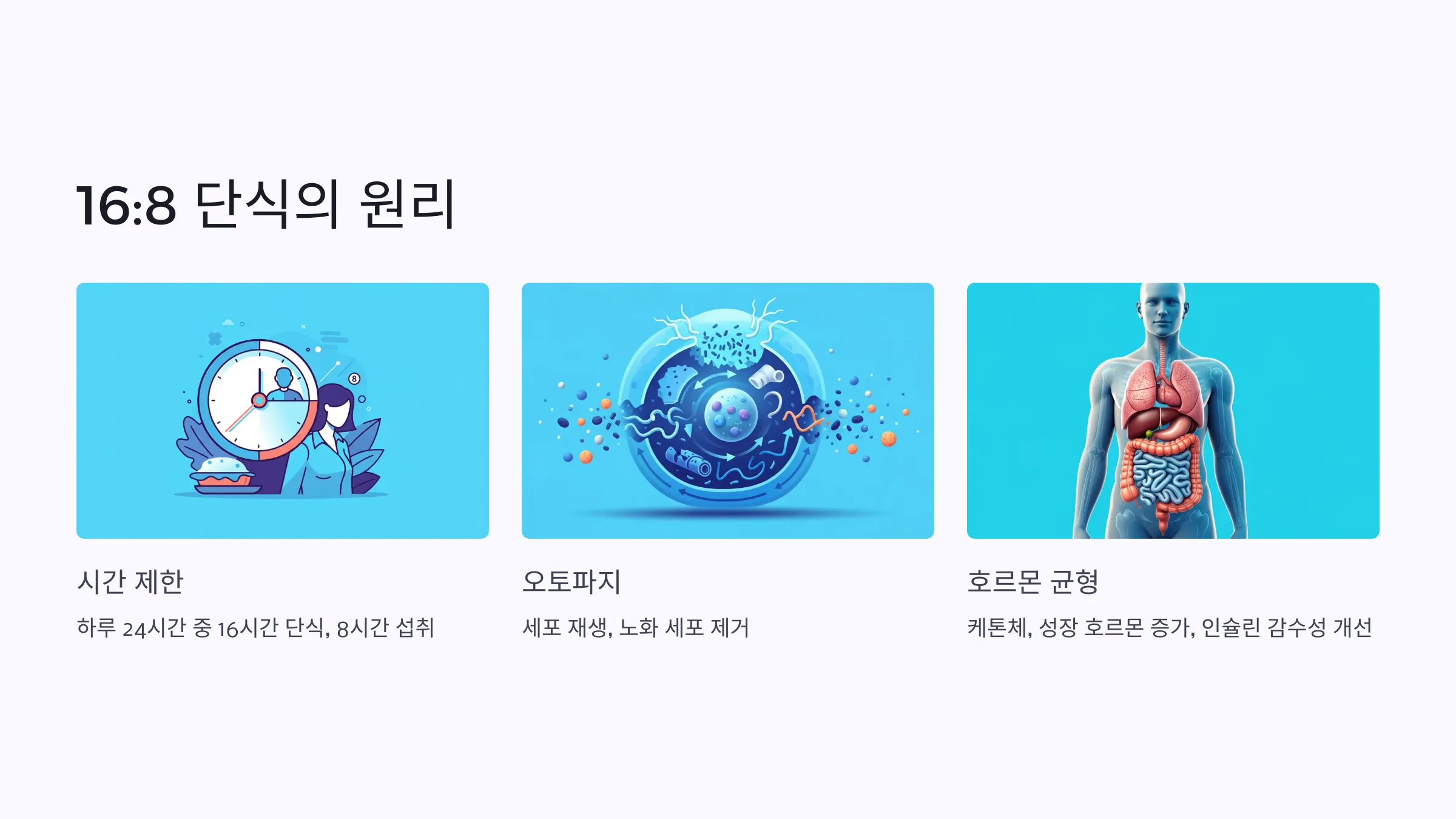 16시간의 공복 상태에서 우리 몸은 '오토파지(자가포식)' 상태로 전환되어 노화 세포를 제거하고 새로운 세포를 생성하는 놀라운 재생 과정을 시작합니다.
